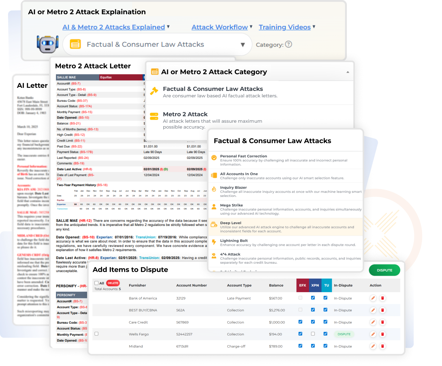 The AI Attack Engine generates highly targeted factual dispute letters using advanced AI strategies. Choose Lightning Bolt, 4x4, 5x5, or Mega Strike to escalate disputes effectively.