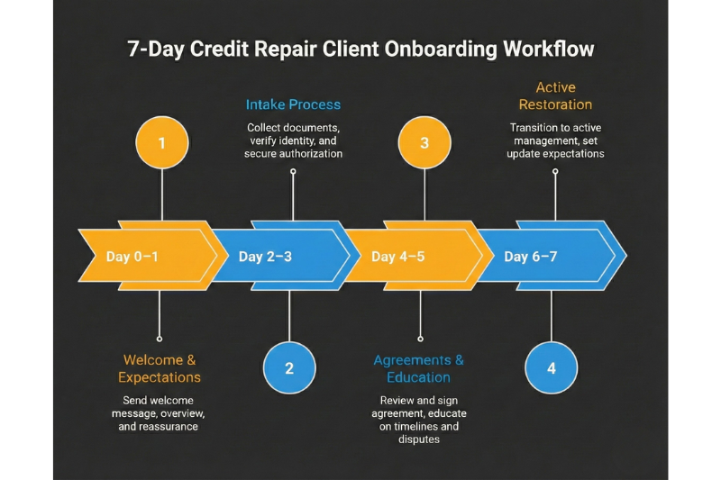 This seven-day framework turns onboarding into a smooth transition instead of a drawn-out guessing game while keeping your credit repair business compliant and organized.