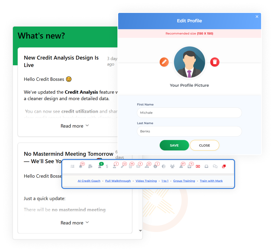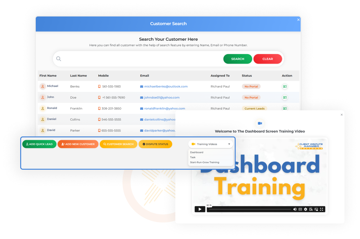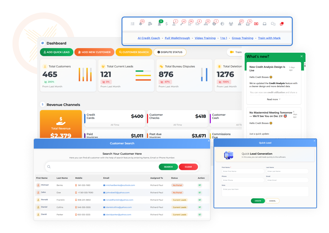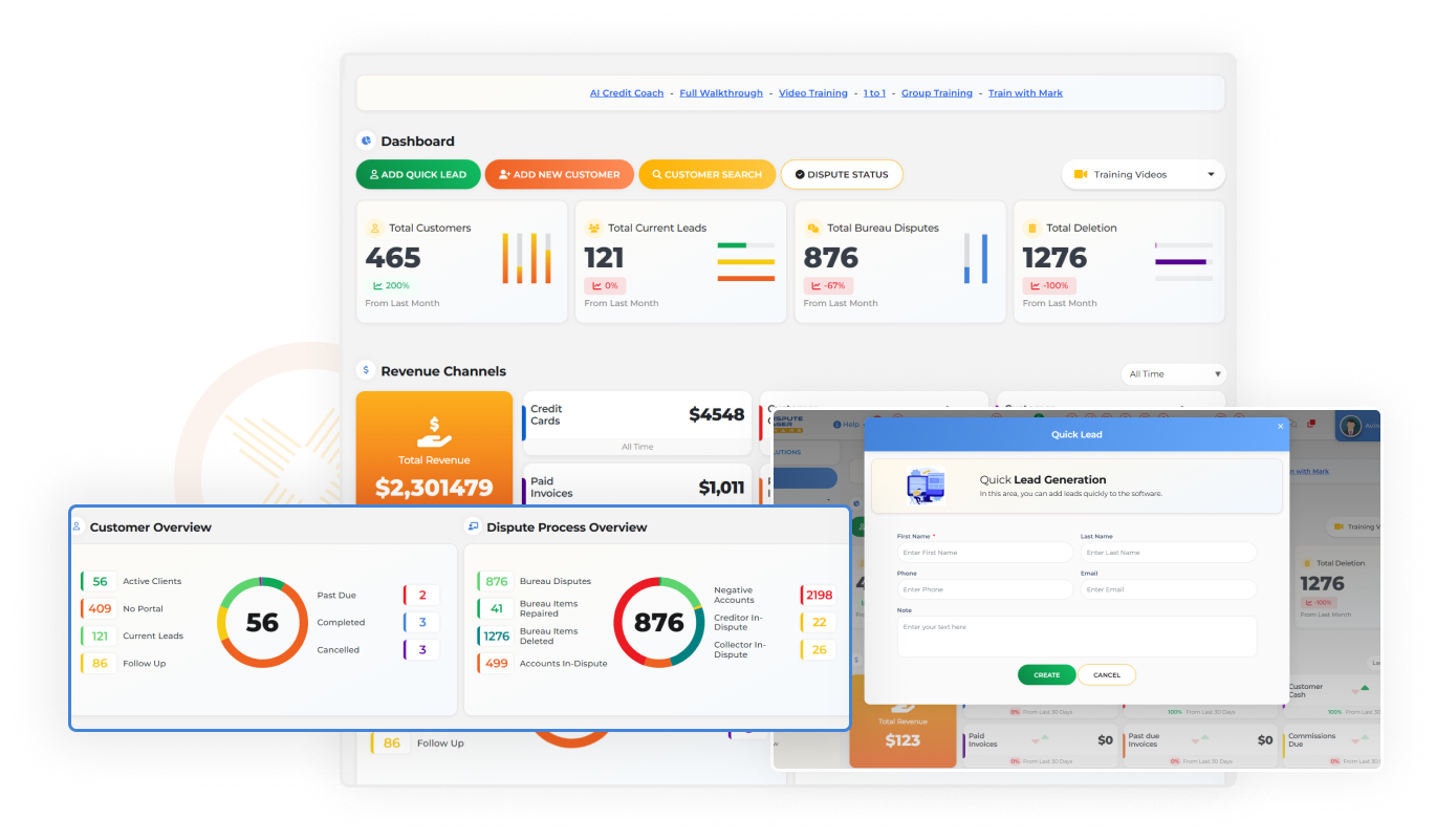 Stay organized and grow your credit repair business with a dashboard built to help you succeed. Track leads, manage disputes, monitor revenue, handle messages, and access training videos—all in one place.