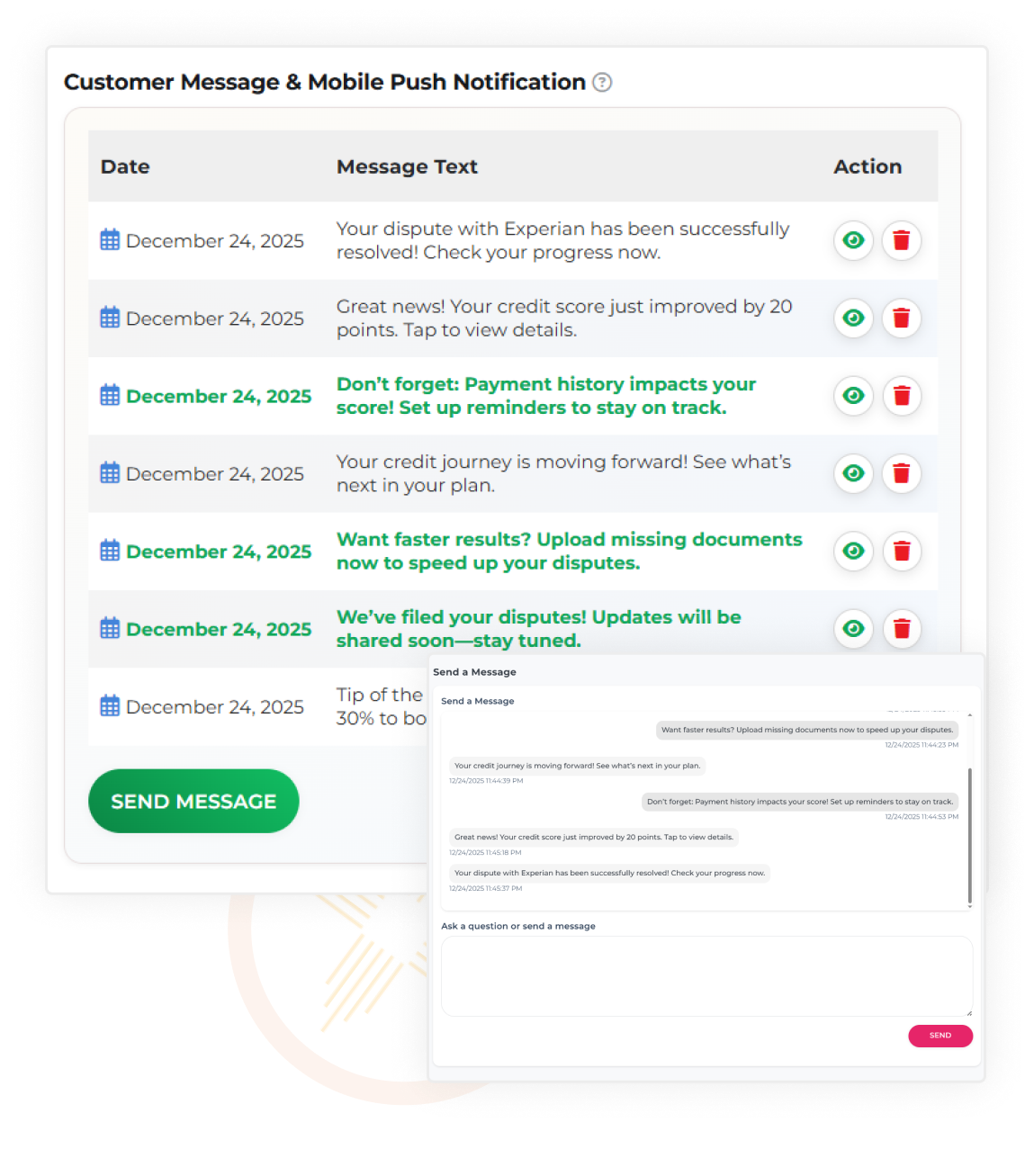 - Send updates on credit score improvements without lifting a finger.
