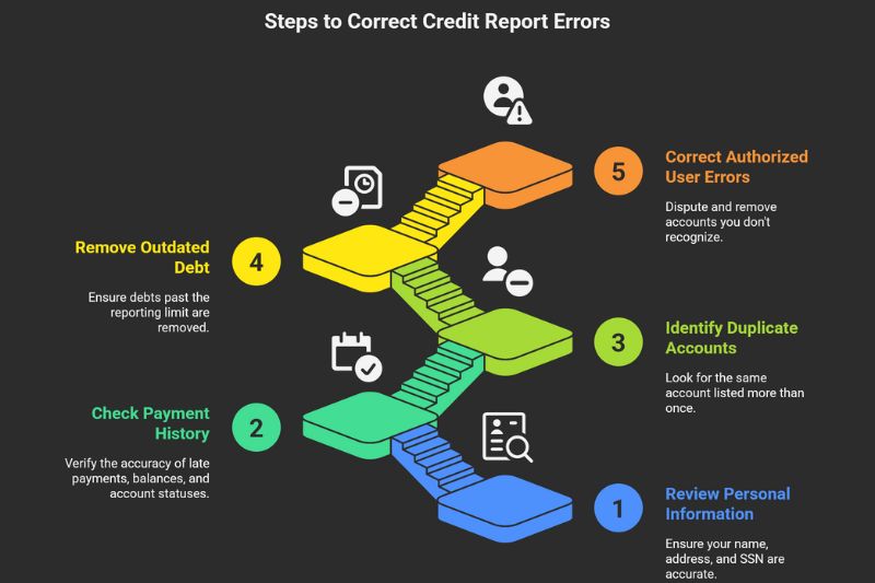 Common credit report errors include wrong personal information, incorrect late payments, wrong balances, duplicate accounts, outdated debts, and authorized user mistakes. These errors can appear when lenders send incorrect data or when credit reporting agencies mix files.
