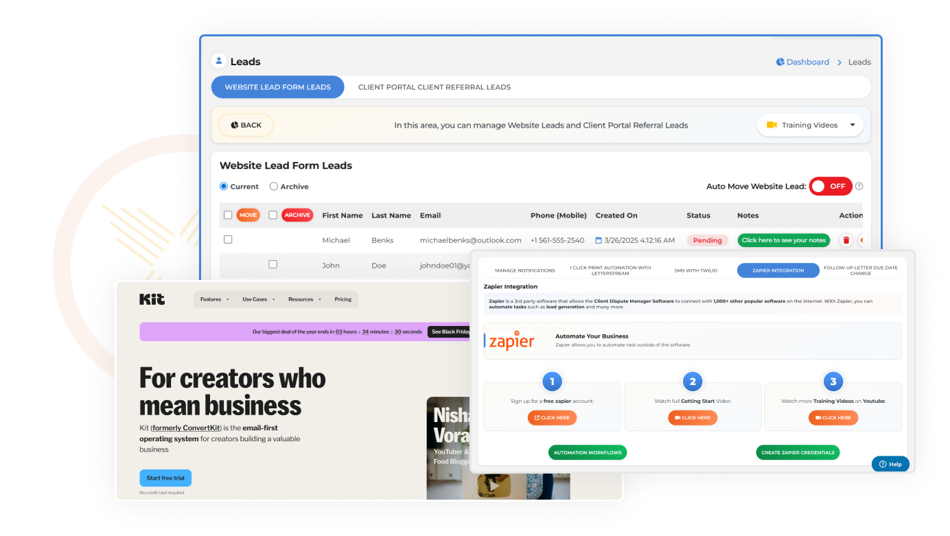 Leads from your site are automatically funneled into Client Dispute Manager, where you can nurture them using email campaigns integrated through Zapier.