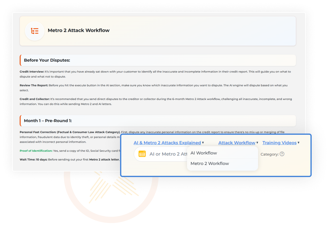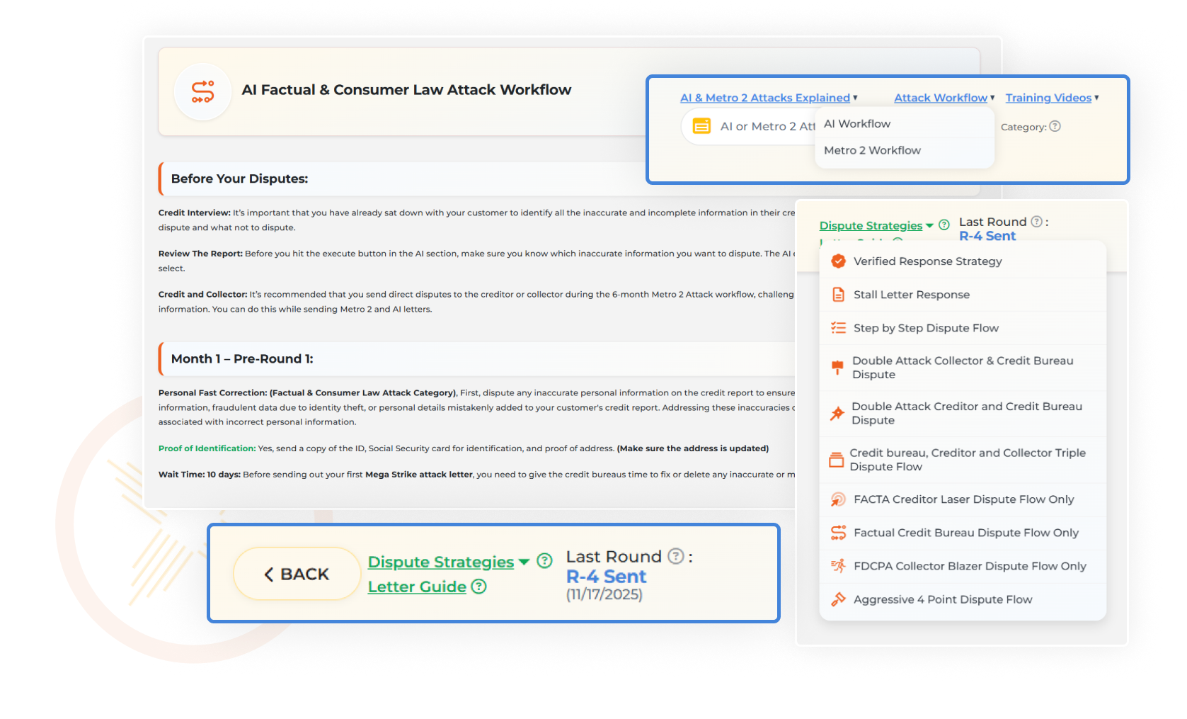Leverage seven unique step-by-step dispute strategies along with three AI- and Metro 2-powered workflows to tackle inaccuracies on your clients’ credit reports.